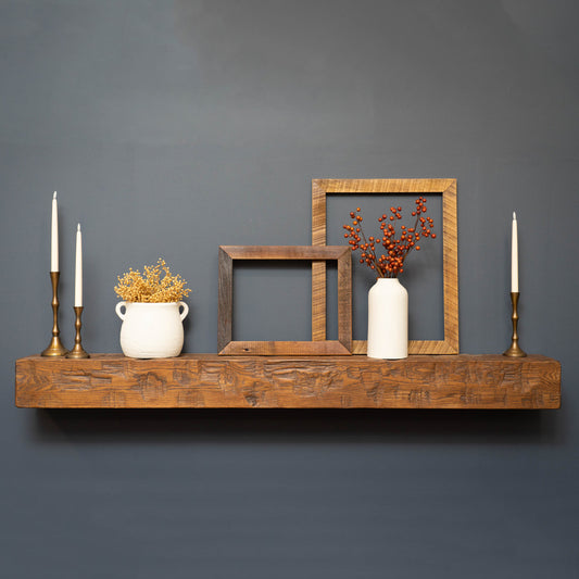 The hand-hewn fireplace mantels are designed to have a hollow center with or without corbels. Without corbels, they become floating shelf mantels.